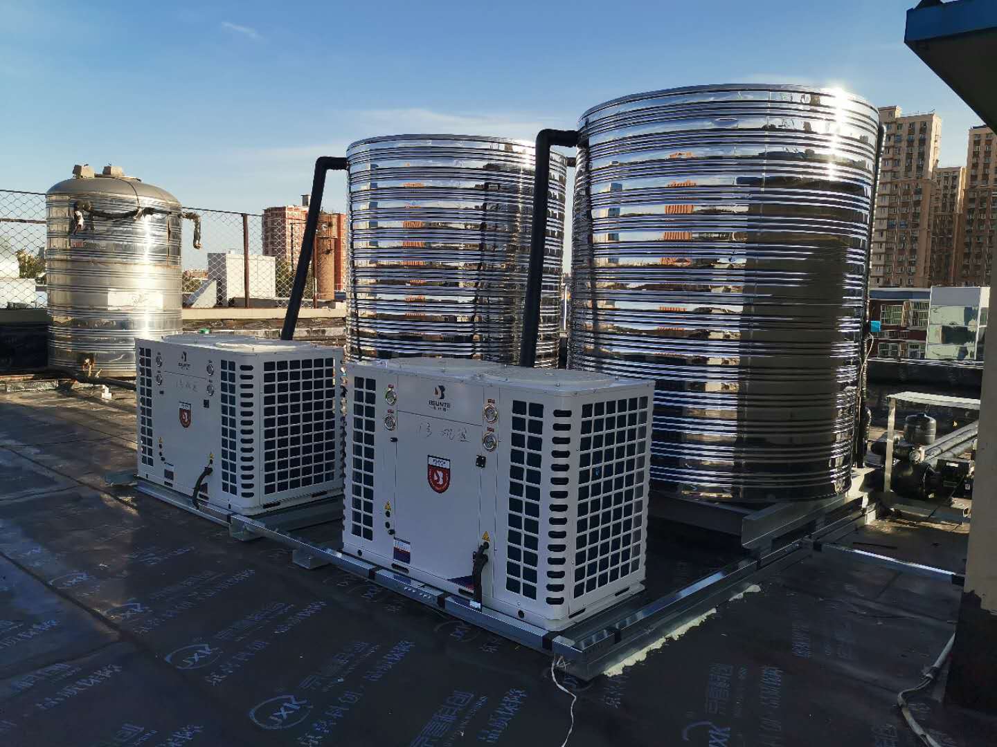 2臺(tái)10匹空氣源熱泵熱水機(jī)組安裝于北京市石景山區(qū)古城西路8號(hào)朗悅商務(wù)酒店2樓,分別配置兩個(gè)6噸不銹鋼保溫水箱。