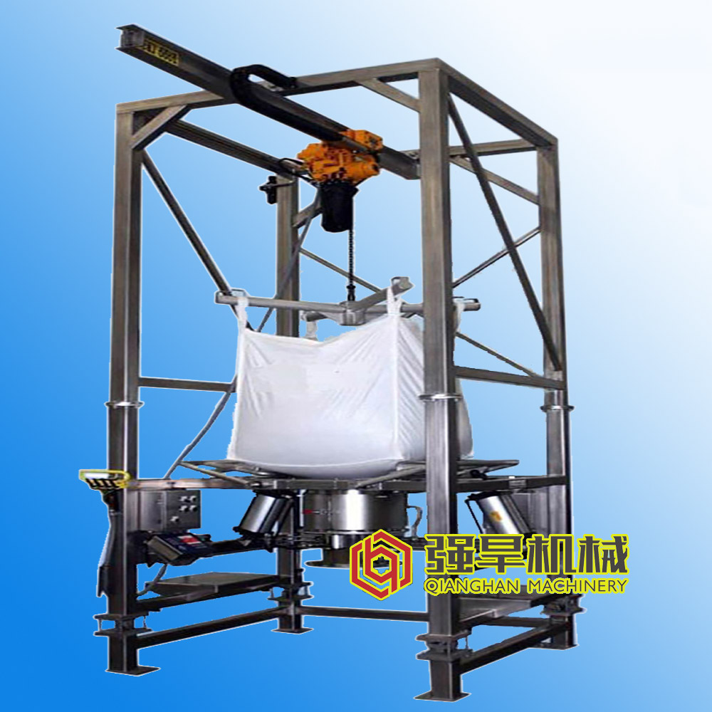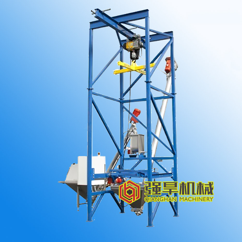 首先準(zhǔn)備卸料工作。人工操作按鈕,移動(dòng)電動(dòng)葫蘆或者使用客戶自己的行車等吊裝工具,將吊架移至噸袋上方。把包裝袋的袋繩掛在噸袋吊架上,鎖好后確保袋繩不會(huì)滑落。