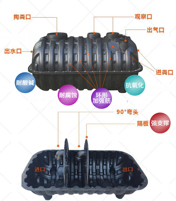 板變形,大大提高了使用者安裝效率。另隔板卡槽設(shè)計(jì),與化糞池卡扣連為一體,承壓強(qiáng),不坍塌。