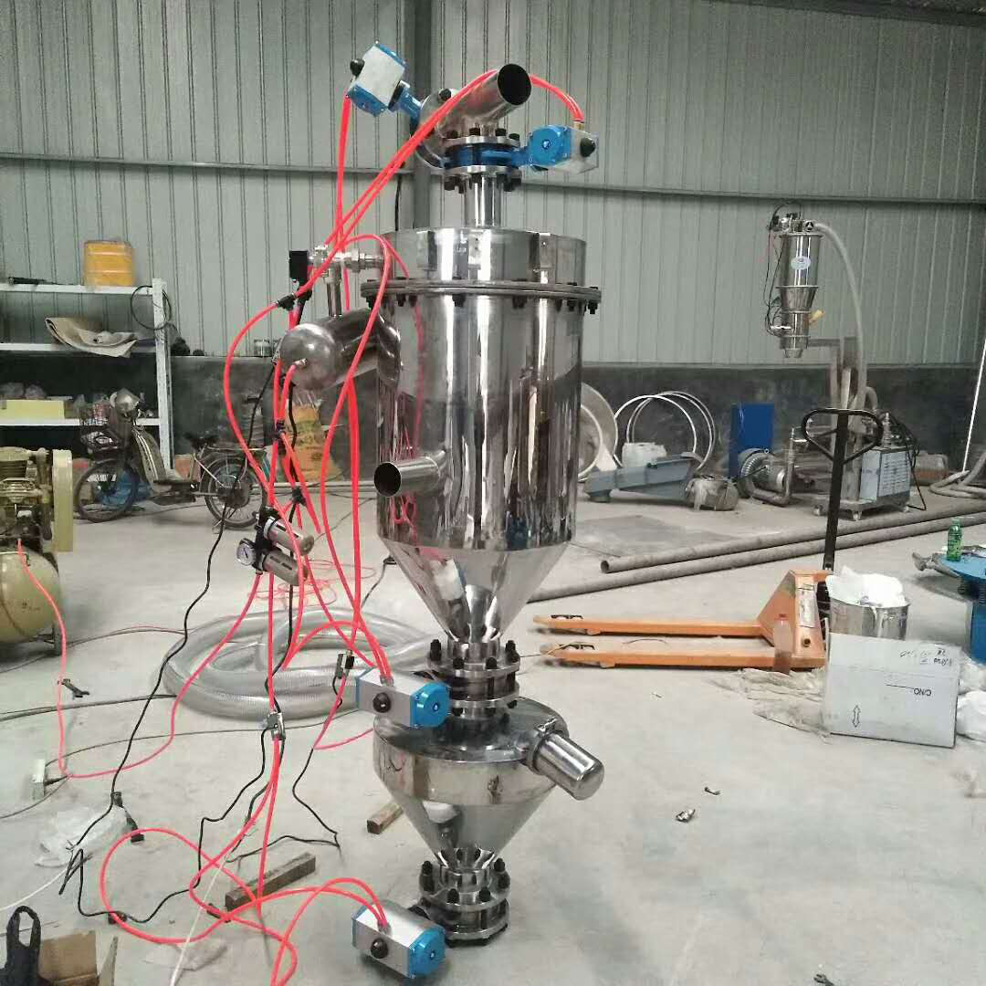 當壓縮空氣供給真空發(fā)生器時,真空發(fā)生器就產(chǎn)生負壓形成真空氣流,物料被吸入吸料咀,形成物氣流,經(jīng)過吸料管到達上料機的料倉內(nèi)。過濾器把物料與空氣徹底分離,當物料裝滿料倉時,控制器會自動切斷氣源,真空發(fā)生器停止工作,同時料倉門自動開啟,物料落到設(shè)備的料斗中。與此同時,壓縮空氣通過脈沖反吹閥自動清洗過濾器。等到時間到或料位傳感器發(fā)出上料信號時,自動啟動上料機。